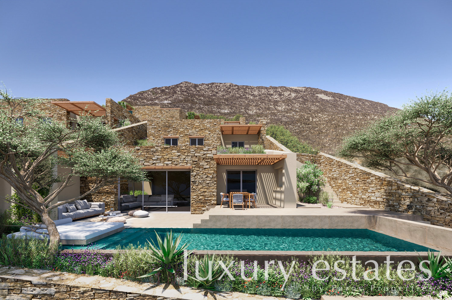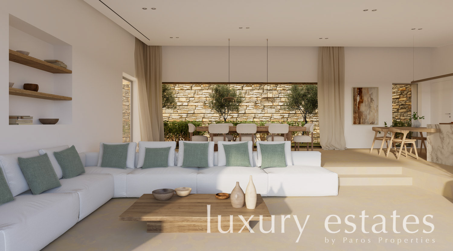 Conceived with a focus on refined modern living and Cycladic simplicity, Villa Selene a 235 m² residence is arranged across spacious interiors and beautifully proportioned outdoor areas. Expansive openings connect the main living spaces to wide terraces, encouraging a seamless flow between indoor comfort and outdoor living, enhanced by pergola-covered areas and sweeping sea panoramas.