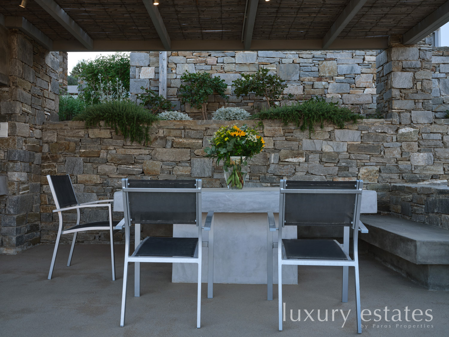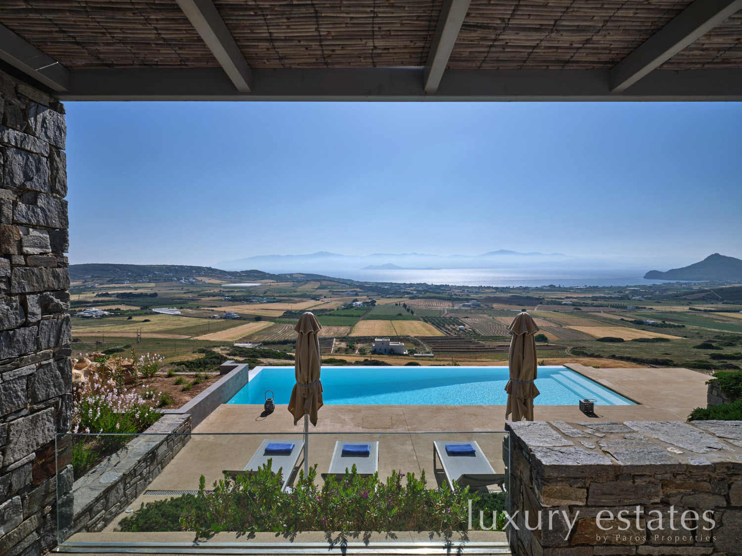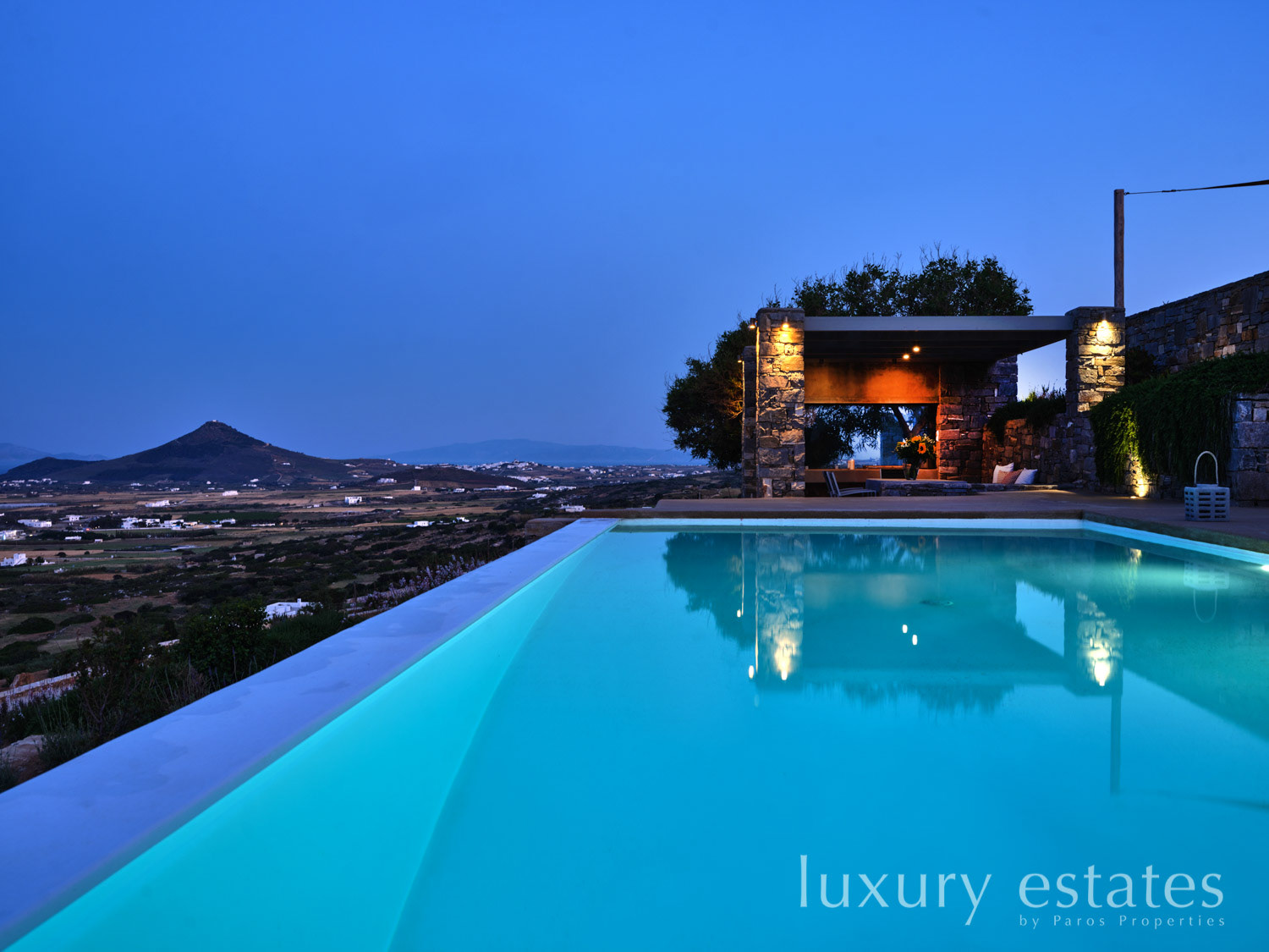 Built on the side of the hill above Isterni area, approximately 5km from the cosmopolitan town of Naoussa, lay this luxurious villa, offering panoramic coastal views towards Naxos island and a private pool.